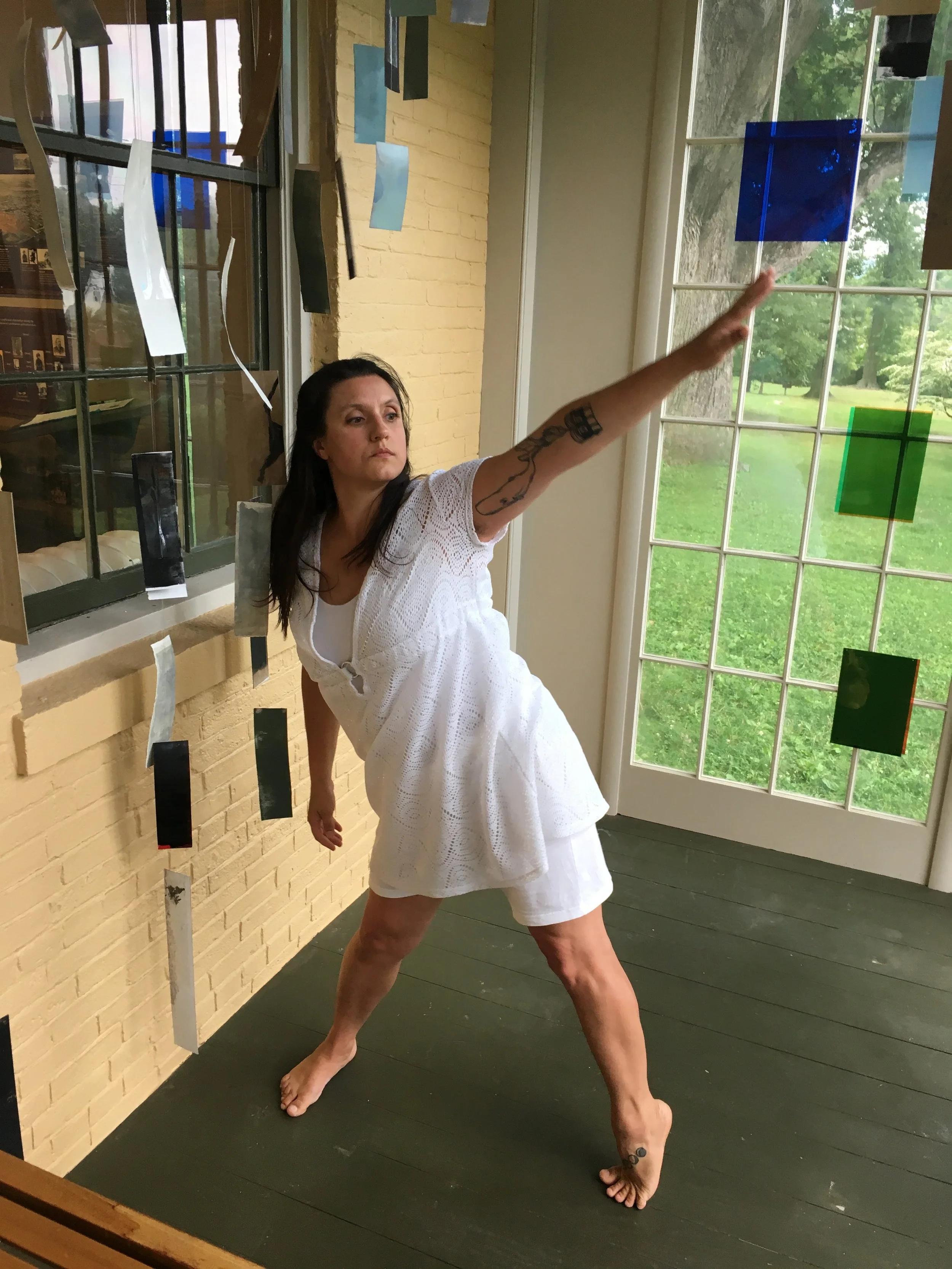 In Formation (2019), Performer/Activator: Visual artist Tereza Swanda, in collaboration with glass artist Ingrid Pichler and sound artist Fletcher Boote, converted Emily’s conservatory at the Emily Dickinson Museum, taking the Dickinson poem “Nature is what we see” as the starting point for an installation with colored gels and painted paper sampling colors found in the landscape, and a soundscape that wordlessly references Emily Dickinson’s poetry. During Amherst Arts Night Plus in July and August, a dance piece was performed in the space by Kelly Silliman.
